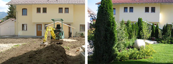So sah der Garten während der Humus-Planie aus, und so vier Wochen später: Durch und durch grün. Und in ein paar Jahren wird vom Nachbarhaus nichts mehr zu sehen sein...
